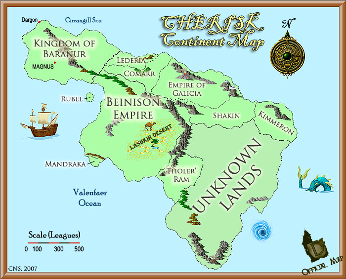 - The entire continent of Cherisk, depicting Dargon, the Kingdom of Baranur, the Beinison Empire, and other very distant lands.